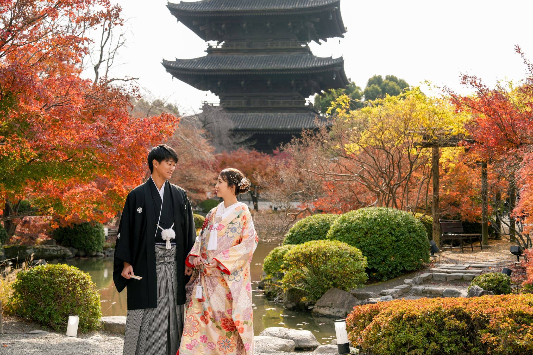 五重塔は、言わずと知れた京都の風景のシンボルです。高さ57メートルの日本最高の塔で、1643年に徳川家光が再建奉納したものです。講堂(重要文化財)にある日本に現存する最古の密教彫刻の一群や金堂、大師堂、蓮花門など見所も多く、境内は史跡に指定されています。