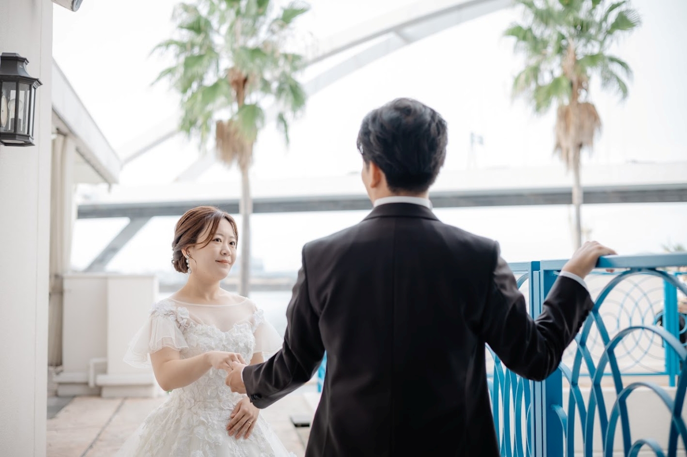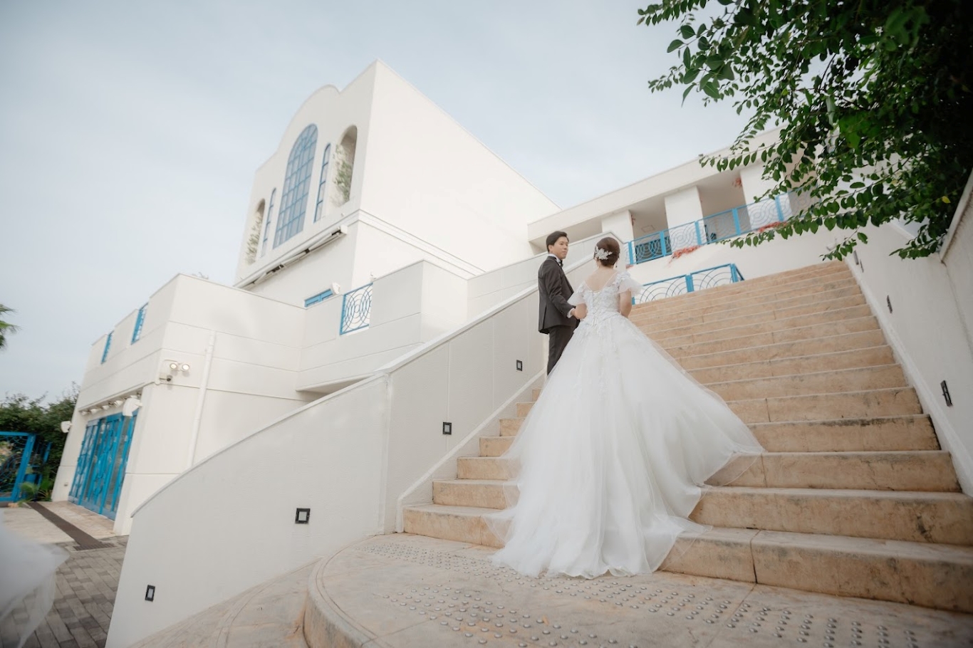 青空に映える白亜の外観や美しいアーチ橋を背景にしたロケーション撮影です。青空と純白の外観のコントラスト、あふれる緑や海に架かるアーチ橋、モニュメントオブジェなどフォトジェニックなロケーションにておふたりの夢が叶います。自然に囲まれたリヴァージュブランで、ここならではのロケーション撮影をお楽しみください。